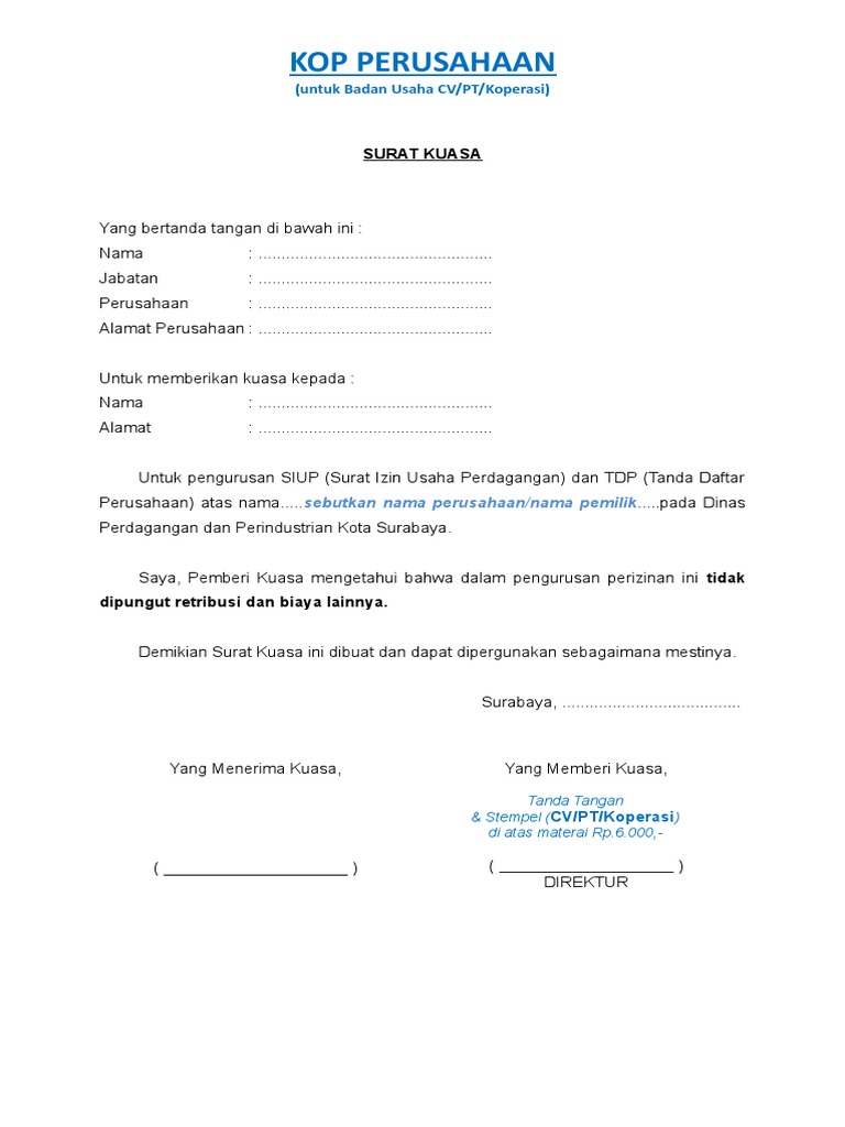 SURAT KUASA UNTUK PENGURUSAN SIUP TDP DAN LAIN LAIN .doc
