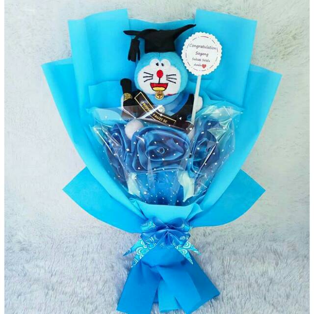 Buket bunga satin wisuda boneka karakter doraemon biru plastik murah | Shopee Indonesia