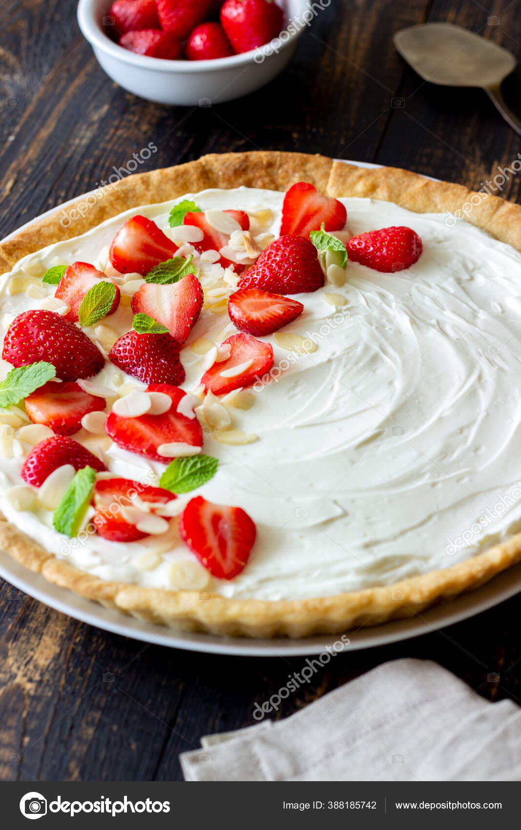 Kue Stroberi Dengan Keju Maskarpone Almond Dan Mint Tart Cheesecake — Stok Foto © VladislavChusov #388185742