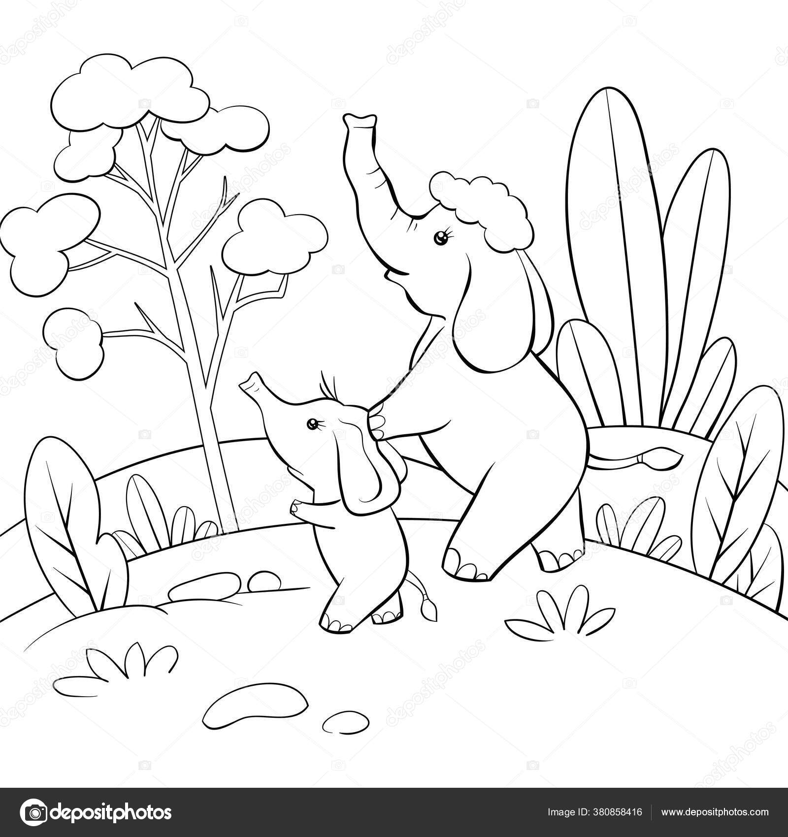 Dua Gajah Pada Gambar Lanskap Alam Untuk Aktivity Buku Mewarnai — Stok Vektor © nonuzza #380858416