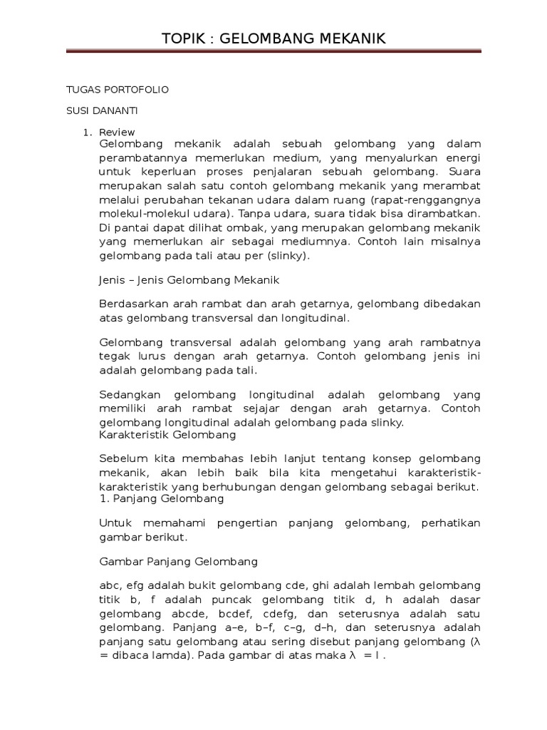 1. PENDAHULUAN 2 HAKEKAT GELOMBANG MEKANIK A. nbsp;· Contoh gelombang mekanik antara lain: gelombang bunyi, gelombang permukaan air, … Contoh Soal: 1. Dalam 1 sekon dihasilkan gelombang - [PDF Document]