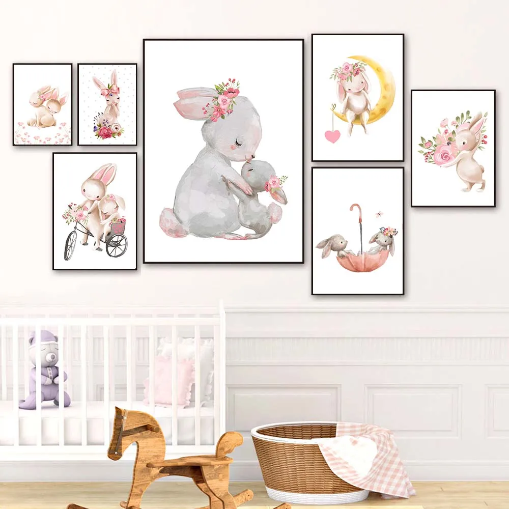 Kelinci Poster Hewan Nursery Wall Art Print Kelinci Kanvas Lukisan Bunga Merah Muda Poster Dinding Gambar Gadis Bayi Dekorasi Kamar|Painting & Calligraphy| - AliExpress