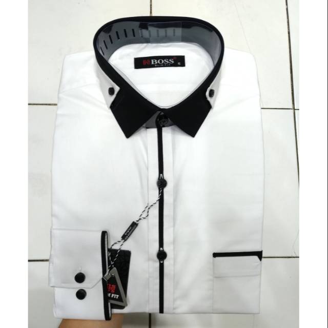 Kemeja Pria Panjang Boss Slimfit Putih List Hitam Kerah Aplikasi | Shopee Indonesia