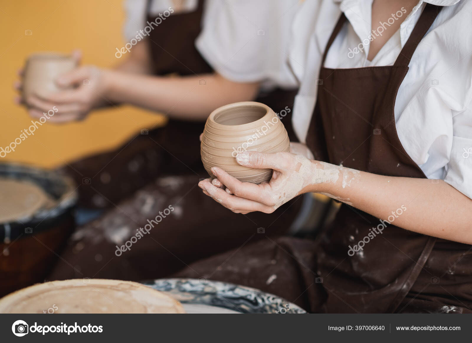 Dua gadis yang bekerja di gerabah roda membuat kerajinan tangan tanah liat di bengkel tembikar, persahabatan dan bimbingan konsep — Stok Foto © romankosolapov #397006640