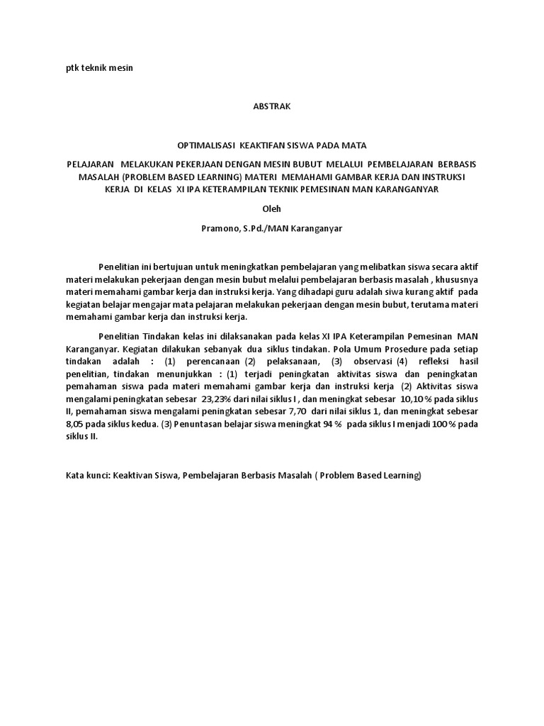 Pelajaran Melakukan Pekerjaan Dengan Mesin Bubut Melalui Pembelajaran Berbasis Masalah (Problem Bl) Materi Memahami Gambar Kerja & Instruksi Kerja Di Kelas Xi Ipa Keterampilan Teknik Pemesinan