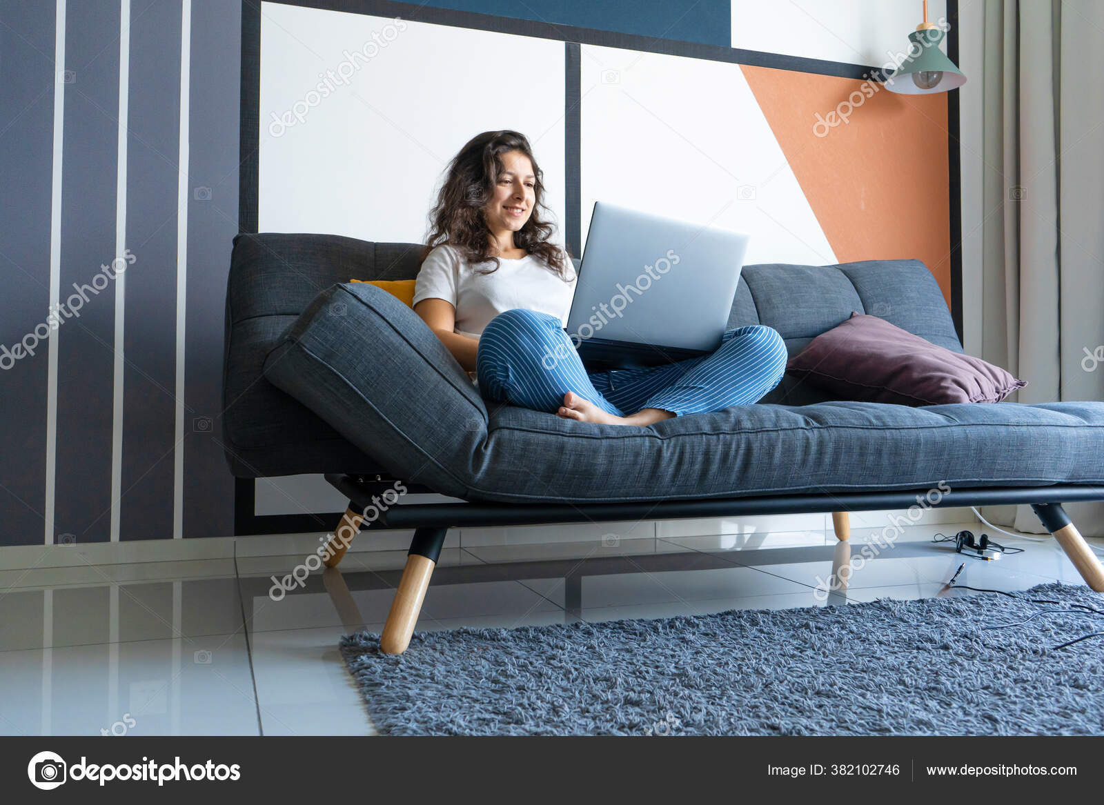 Gadis Cantik Duduk Dengan Laptop Sofa Kamar Bergaya Bekerja Dari — Stok Foto © Kukota #382102746