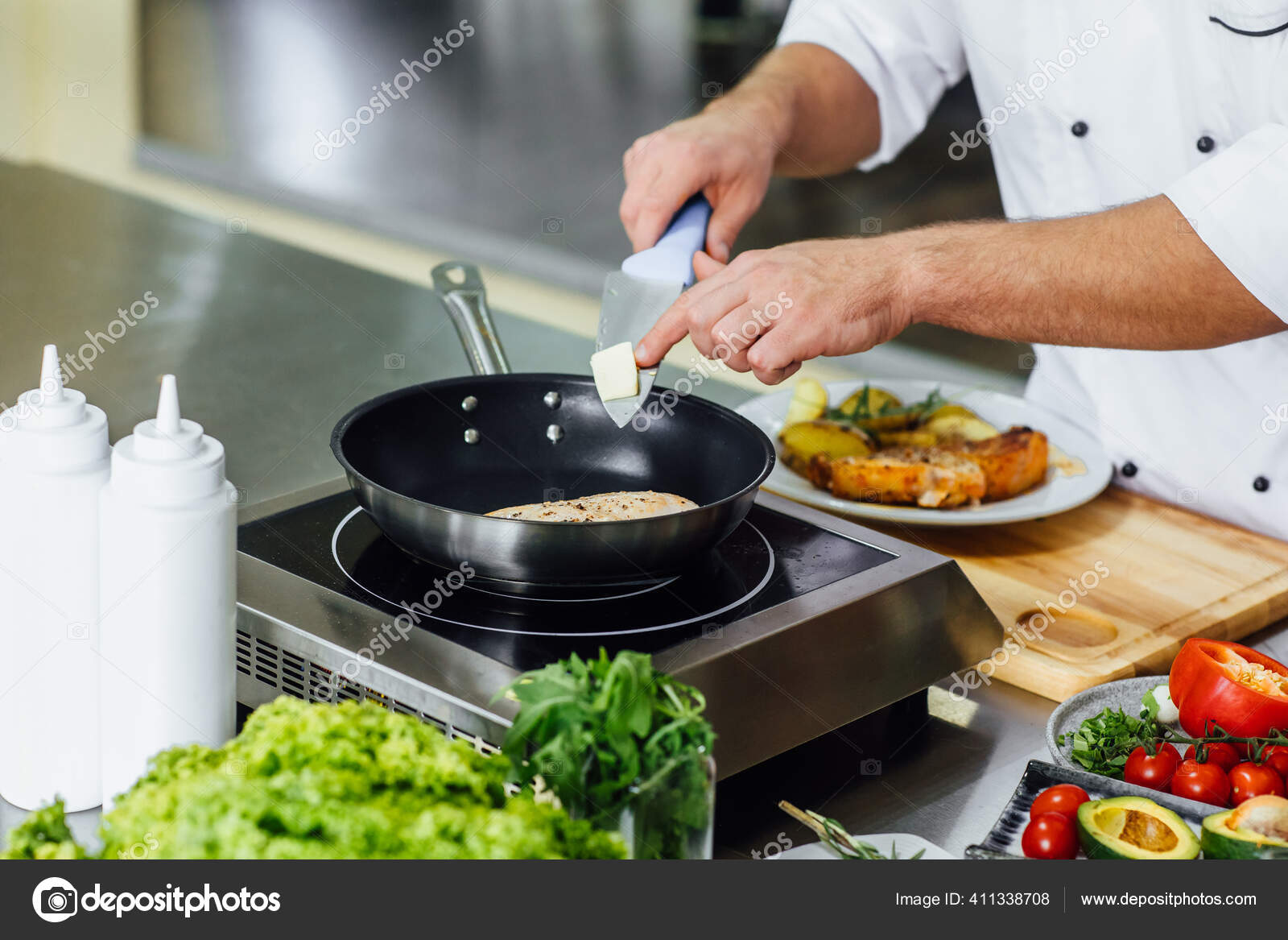 Chef Memanggang Potongan Ayam Atas Kompor Sayap Memasak Dapur Restoran Stok Foto © taras_nagirnyak #411338708
