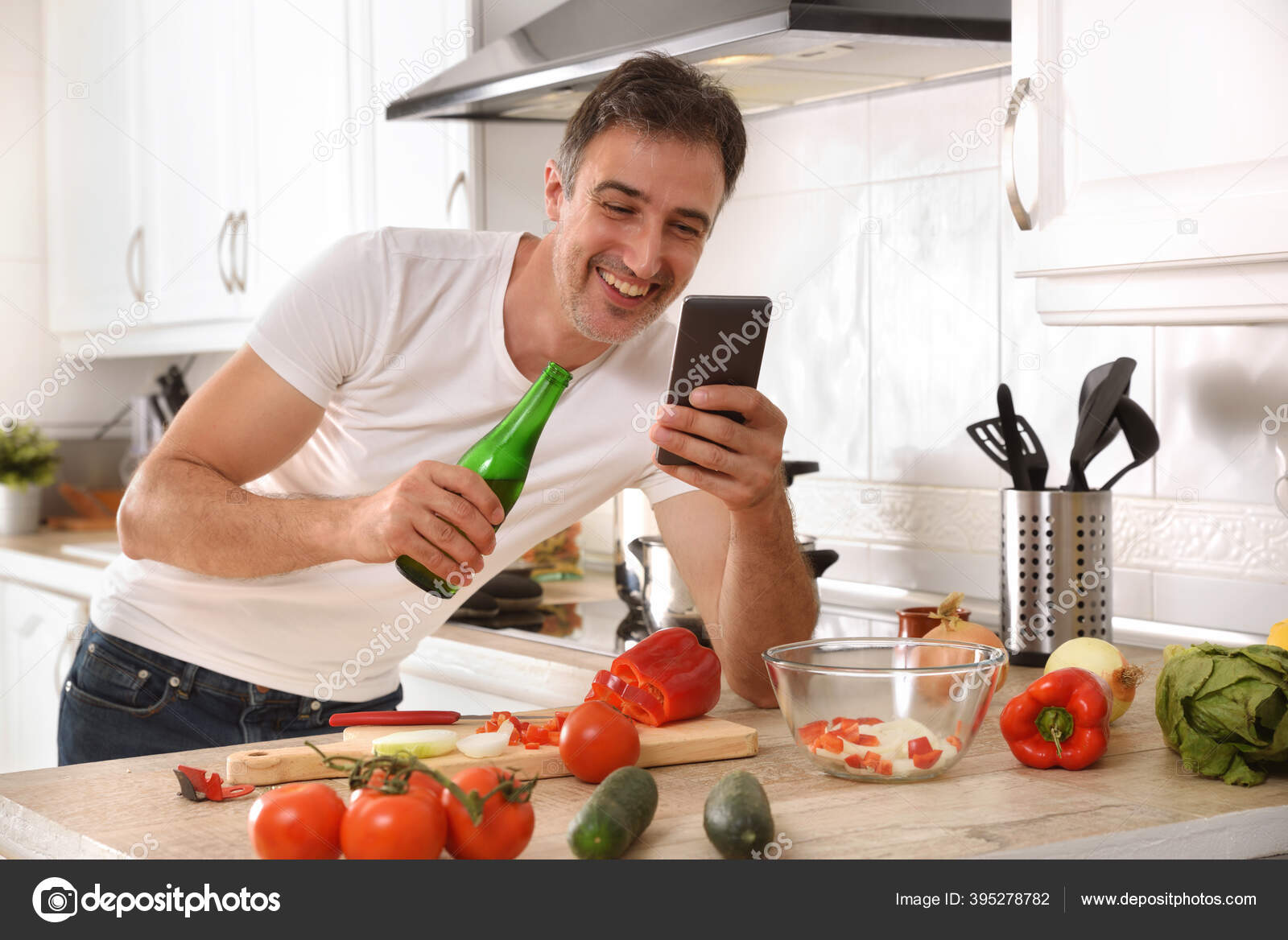 Pria Bahagia Dapur Melihat Ponsel Dan Minum Bir Sambil Memasak Stok Foto © davizro #395278782