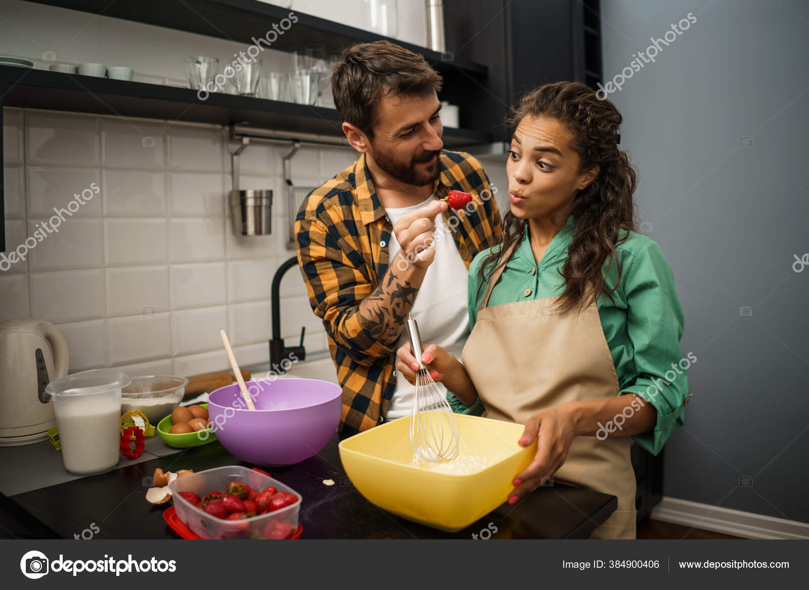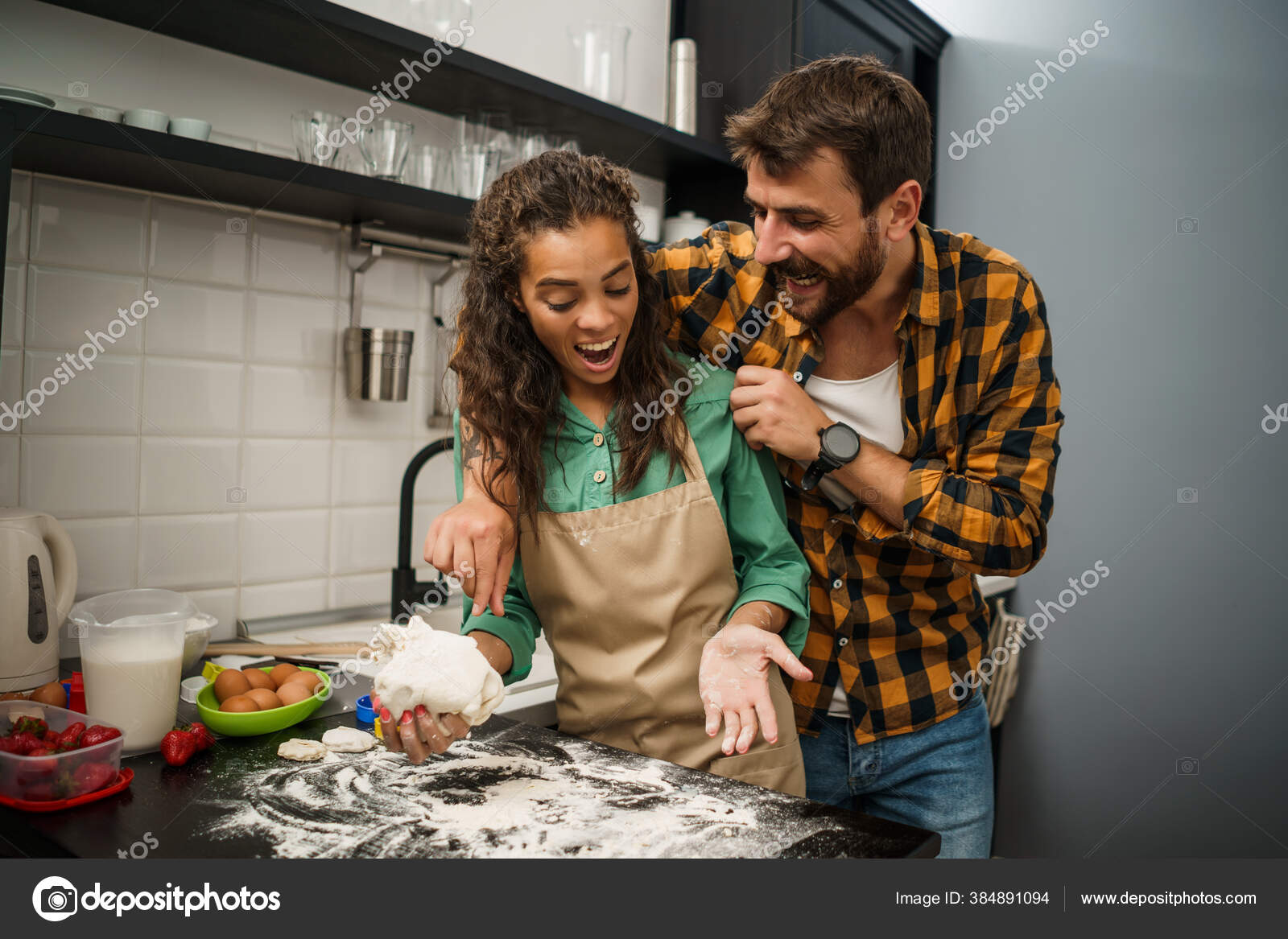 Pasangan Multietnis Yang Bahagia Memasak Dapur Mereka Mereka Membuat Kue Stok Foto © Photodjo #384891094