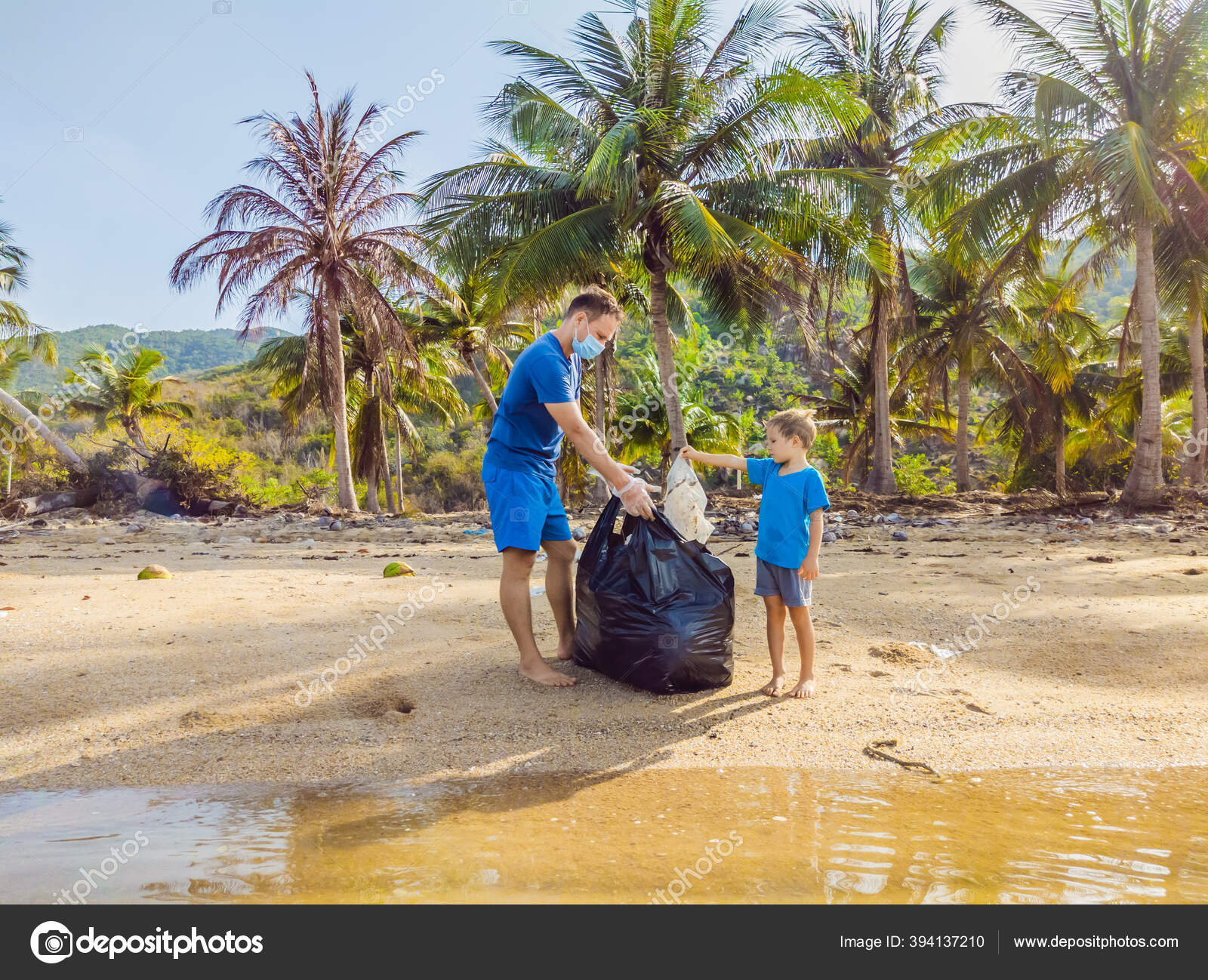Aktivis keluarga muda yang bahagia mengumpulkan sampah plastik di pantai. Ayah dan anak sukarela membersihkan sampah. Masalah polusi lingkungan. Rekreasi gaya hidup luar ruangan. Pendidikan alami anak-anak — Stok Foto © Siturn #