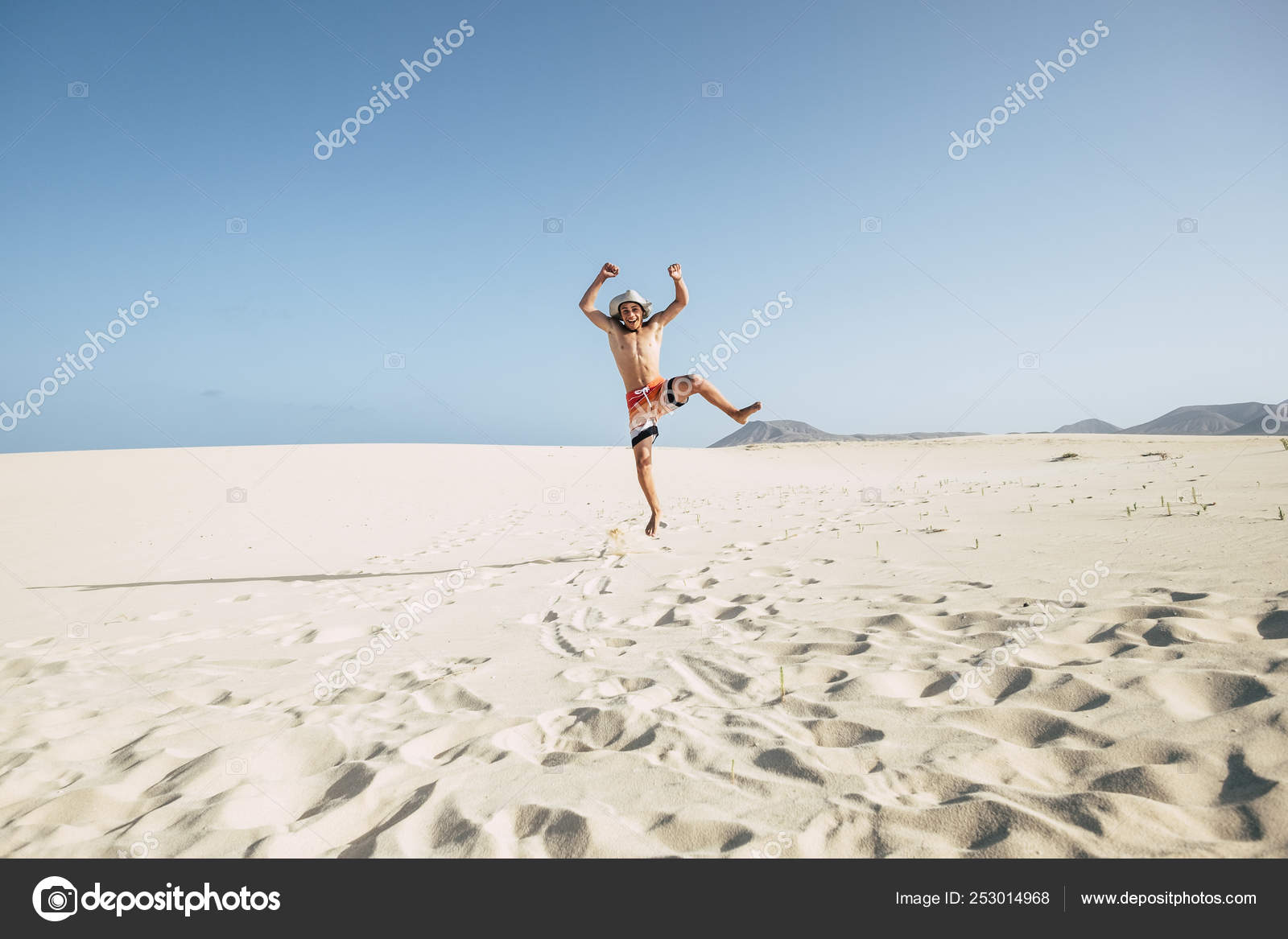 Remaja Gila Yang Lucu Melompat Dengan Kebahagiaan Pasir Gurun Atau — Stok Foto © simonapilolla #253014968
