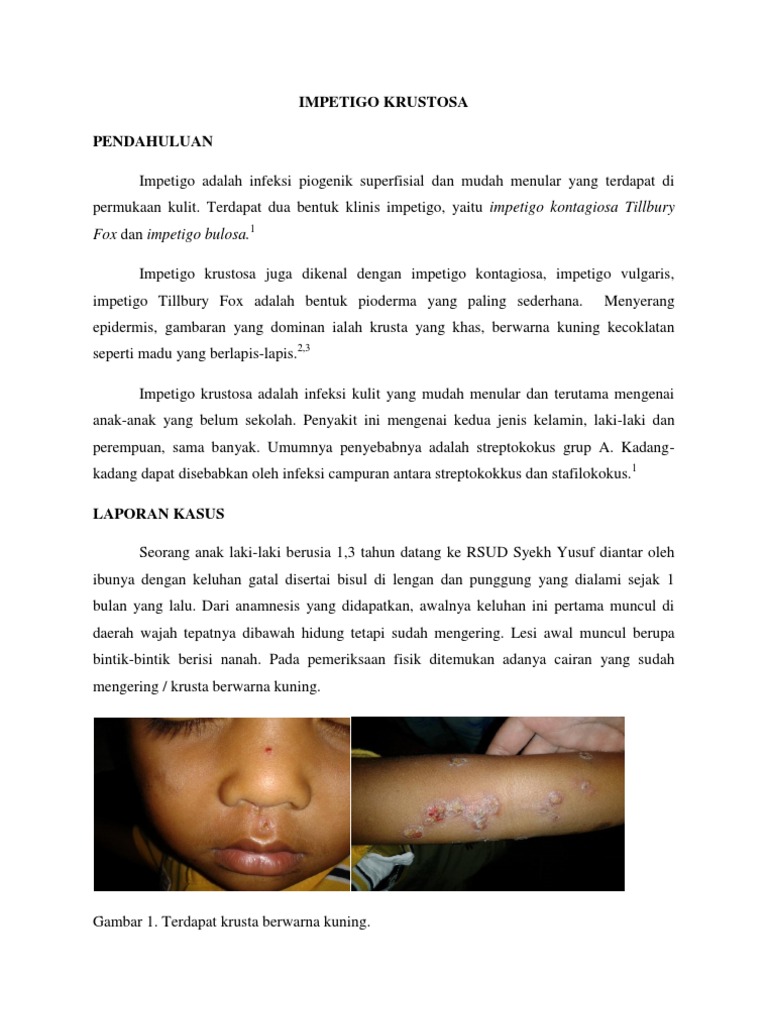 IMPETIGO KRUSTOSA PENDAHULUAN Impetigo adalah infeksi piogenik superfisial dan mudah menular yang terdapat di permukaan kulit.