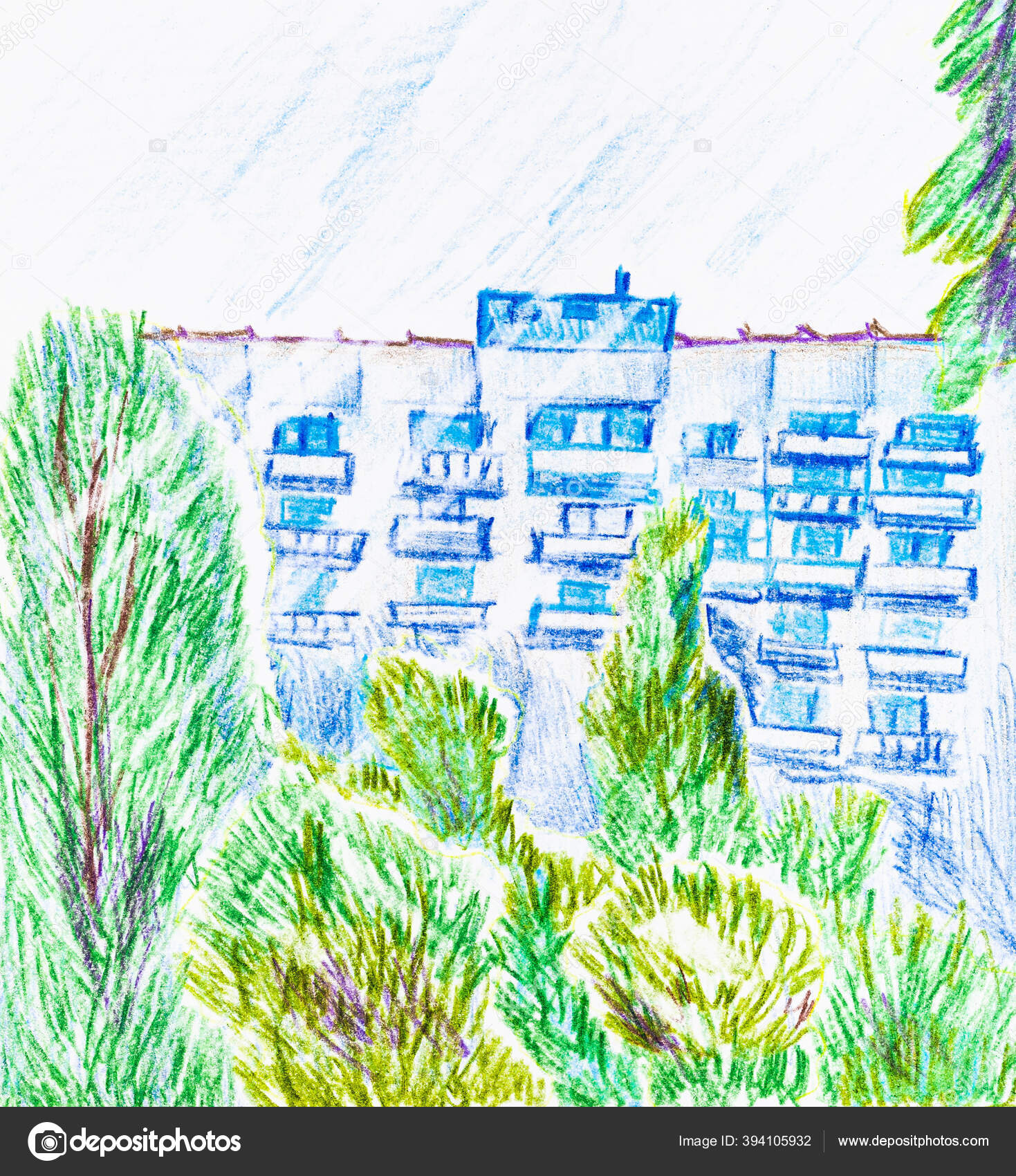 Sketsa Pohon Hijau Dan Rumah Apartemen Kota Musim Panas Digambar — Stok Foto © vvoennyy #394105932