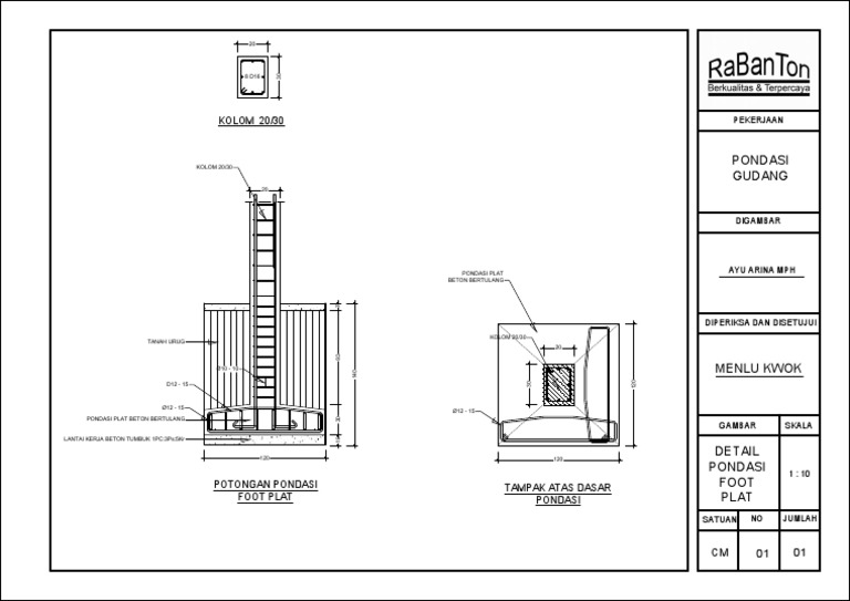 Detail Pondasi Foot Plat Beton Bertulang - Contoh Gambar AutoCAD