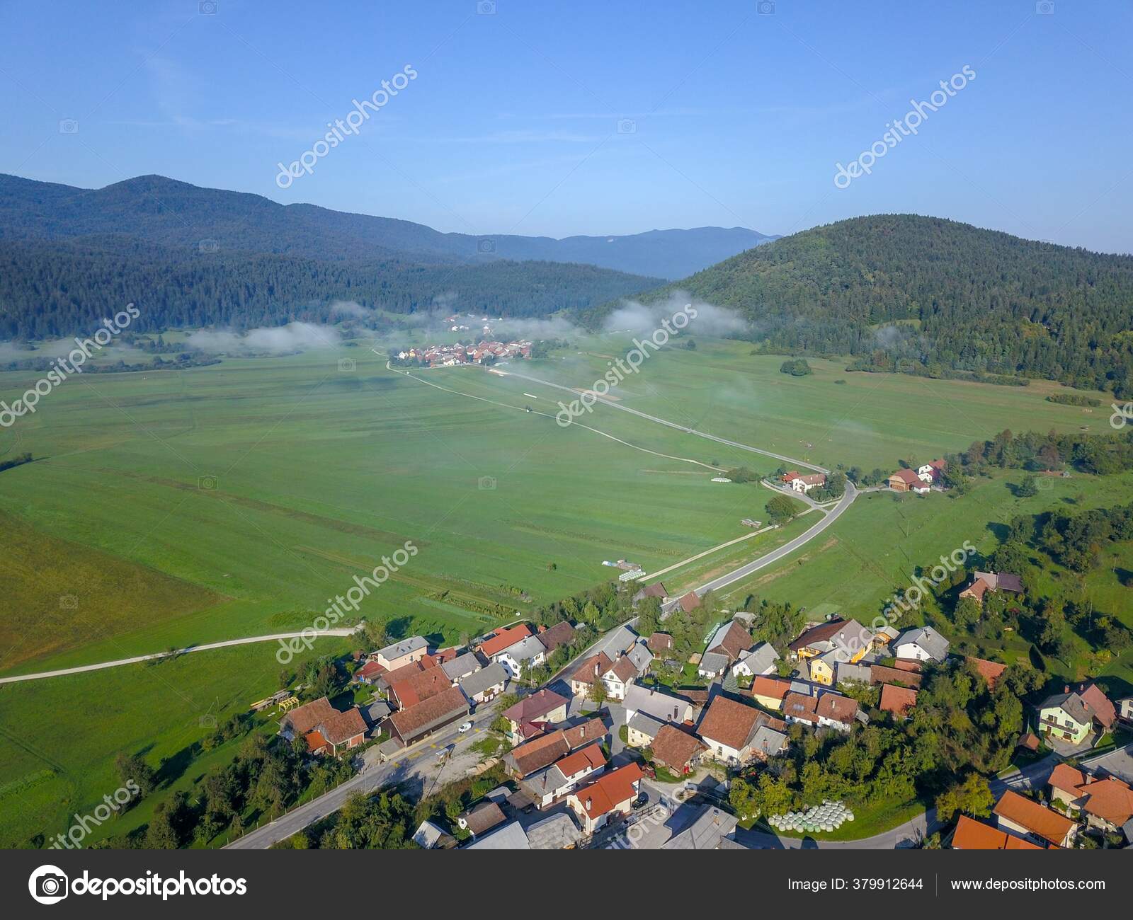 Sebuah Tembakan Udara Dari Lapangan Dengan Rumah Rumah Dan Pegunungan — Stok Foto © Wirestock #379912644