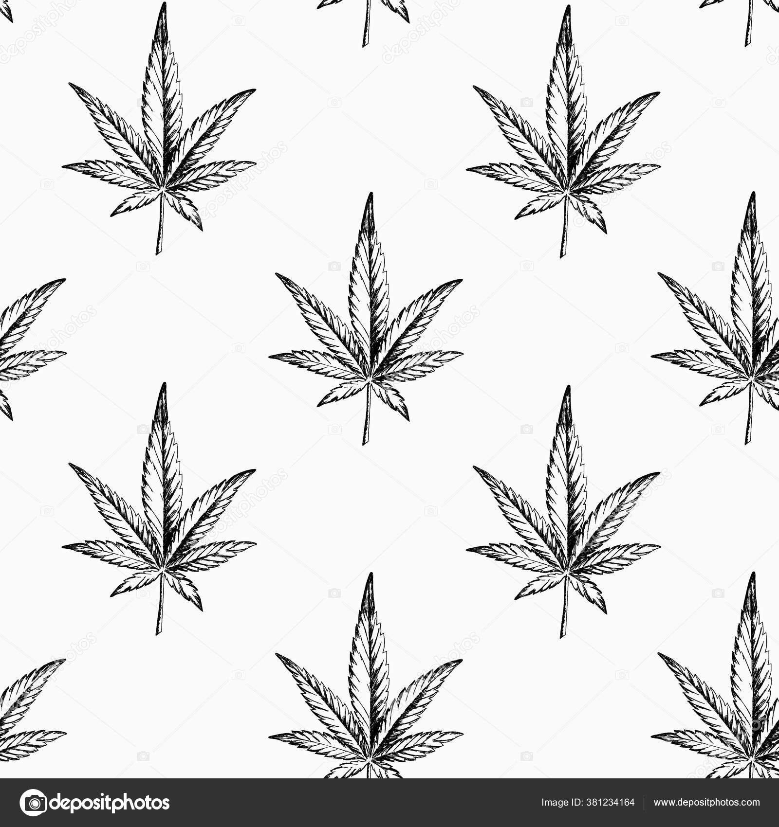 Marijuana meninggalkan pola mulus. Tinta rami gambar tangan untuk kemasan, spanduk dan kertas scrapbooking. Garis luar kanabis. Stok Vektor © Ainaliora #381234164