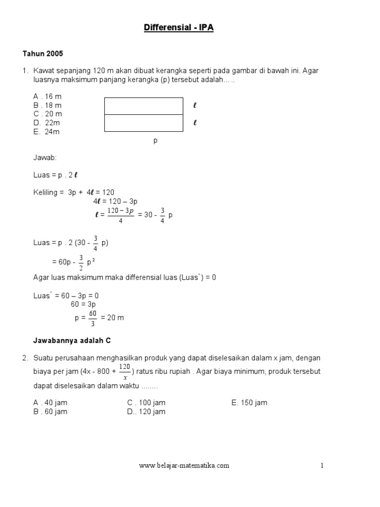 SOAL-SOAL TURUNAN FUNGSI - Tampomas, Turunan Fungsi, Soal-soal Latihan … Seorang petani mempunyai kawat sepanjang 80 meter, … A. 160 m B. 200 m C. 340 m D. 400 m … - [PDF Document]
