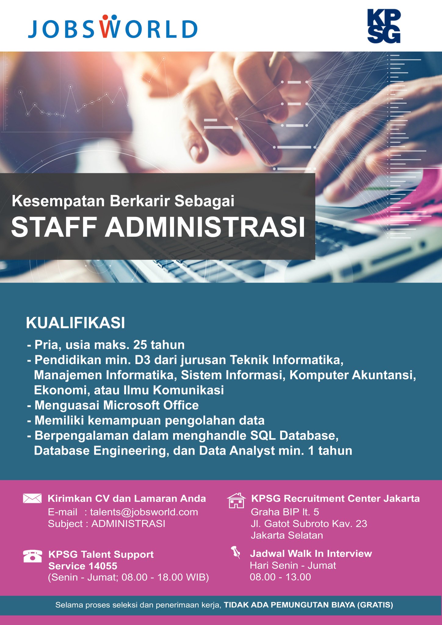 Talent Source KPSG on Twitter: “Anda adalah pria yang mempunyai kemampuan menghandle SQL Database? Andalah yang kami cari!! Terbuka kesempatan untuk menjadi Staf Administrasi. Kirimkan CV dan lamaran Anda ke talents@jobsworld.com dengan