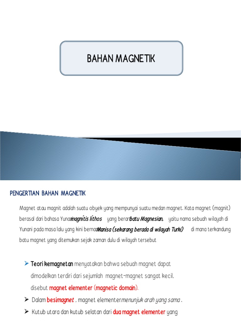 bahan-magnet.ppt - BAHAN MAGNETIK PENGERTIAN BAHAN MAGNETIK Magnet atau magnit adalah suatu obyek yang mempunyai suatu medan magnet Kata magnet(magnit | Course Hero