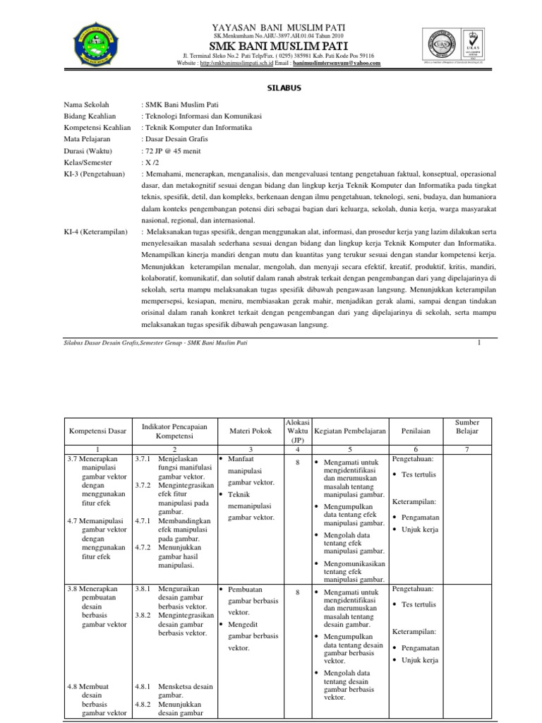 2. SILABUS Dasar Desain Grafis.pdf - SILABUS Nama Sekolah Bidang Keahlian Kompetensi Keahlian Mata Pelajaran Durasi(Waktu Kelas/Semester | Course Hero