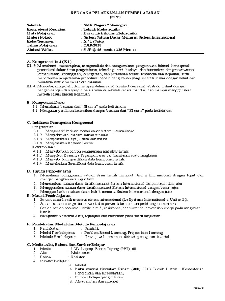 Rpp 2019 Teknik Dasar Listrik Dan Elektronika Kelas x Kd 1