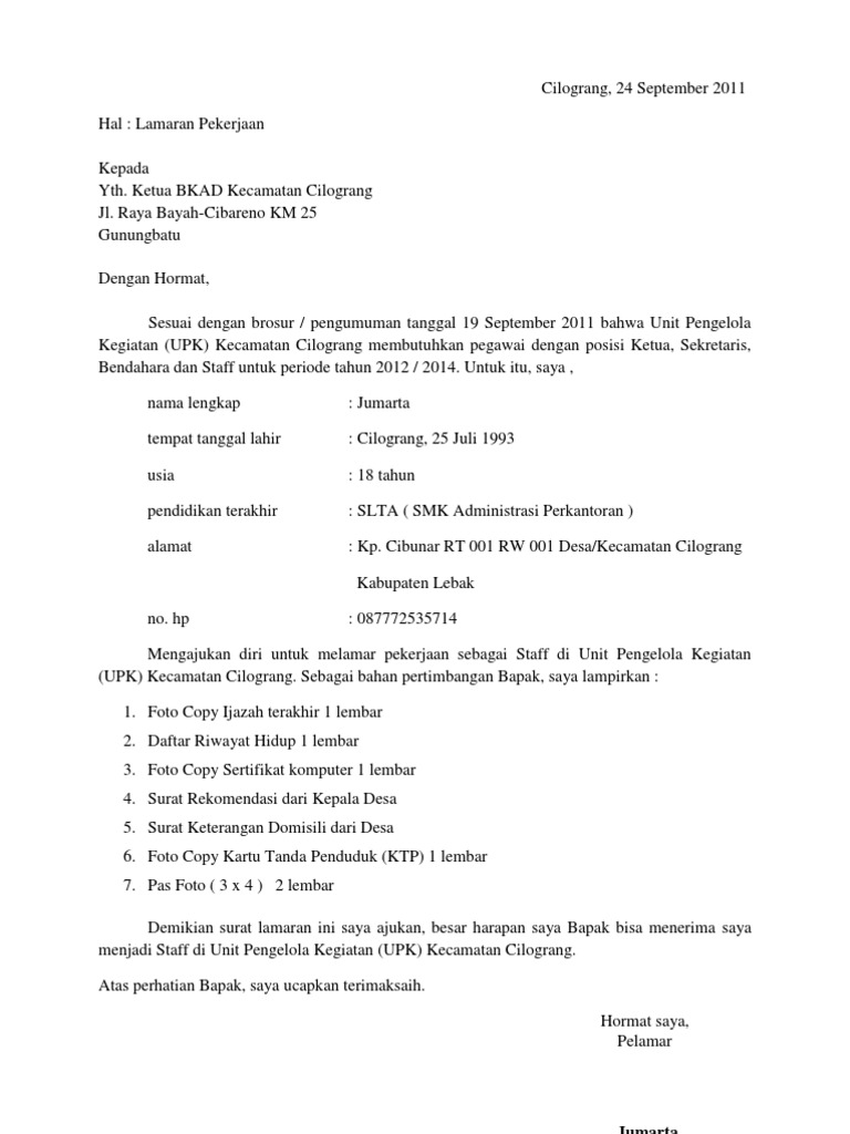 Contoh Surat Lamaran Kerja Lulusan Smk Jurusan Tkj Gawe Cv – Cute766