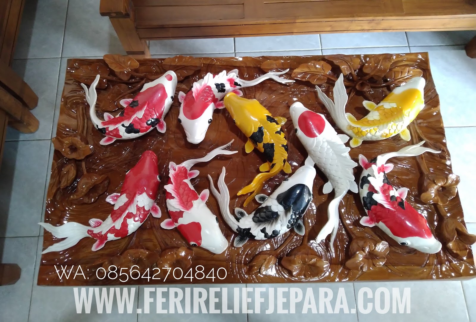 Relief Motif Ikan Koi, ukir relief 9 ikan koi. relief motif sembilan ikan koi
