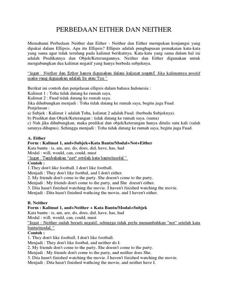 Penjelasan Dan Perbedaan Either-Neither Serta Contohnya Dalam Bahasa Inggris