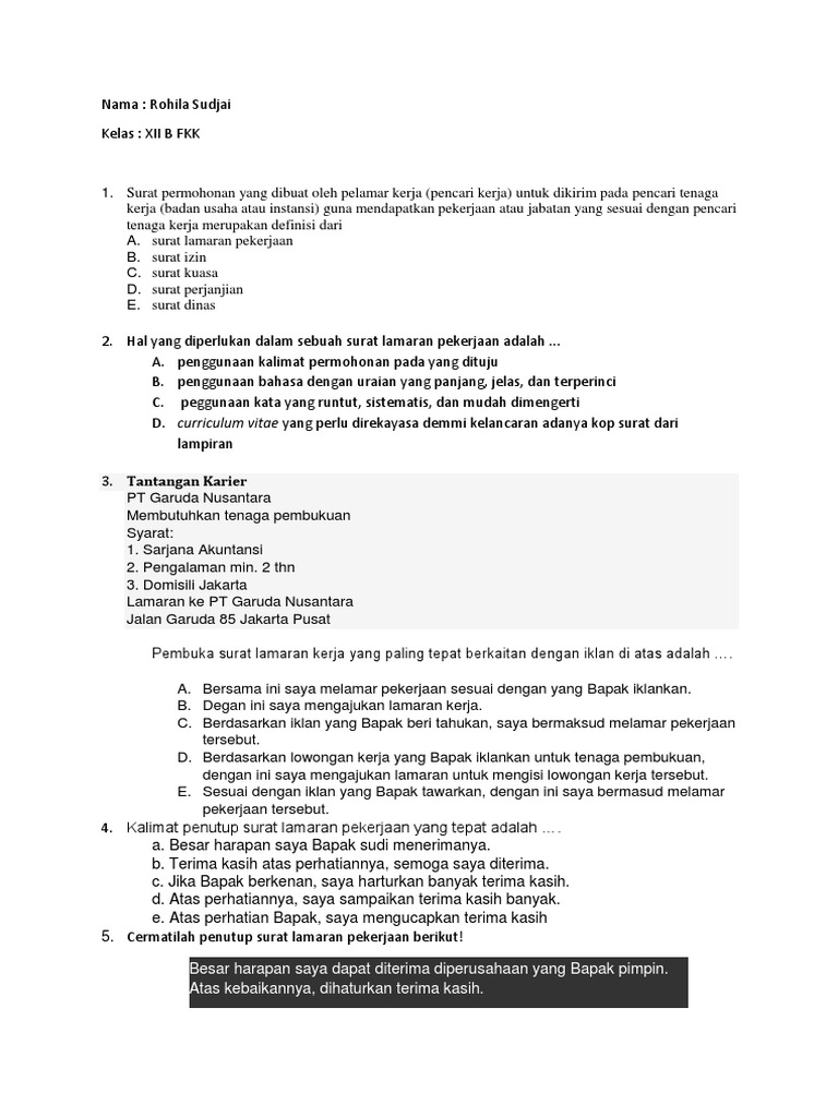 Soal Soal Materi Surat Lamaran Pekerjaan