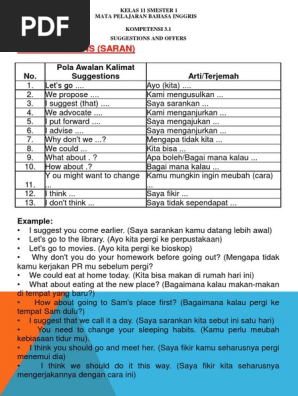 A. Suggestions (Saran): No. Pola Awalan Kalimat Suggestions Arti/Terjemah