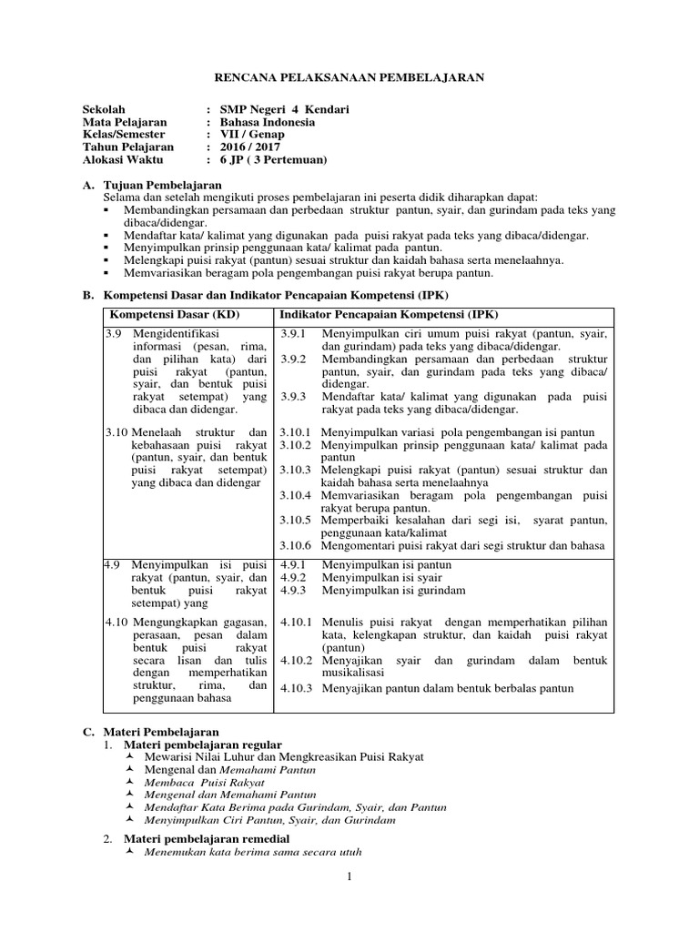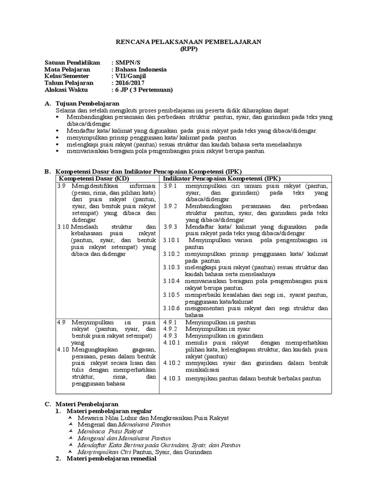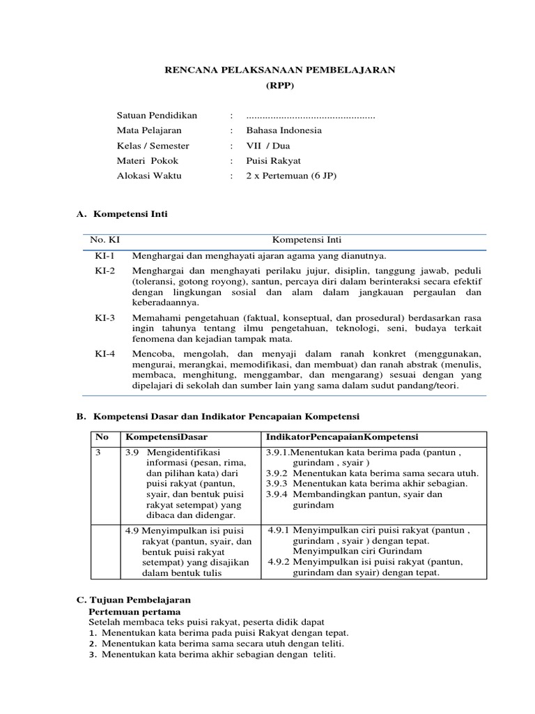RPP KD 3.9 Dan KD 4.9 (Puisi Rakyat)