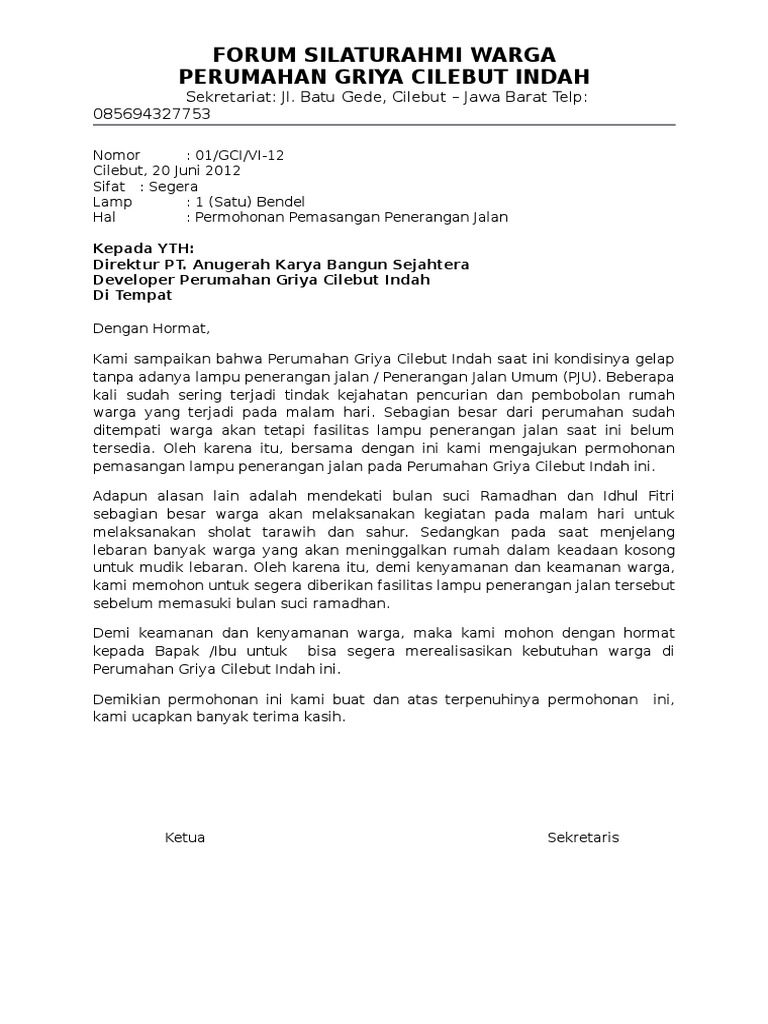 Contoh Surat Permohonan Penerangan Jalan Umum – Cute766