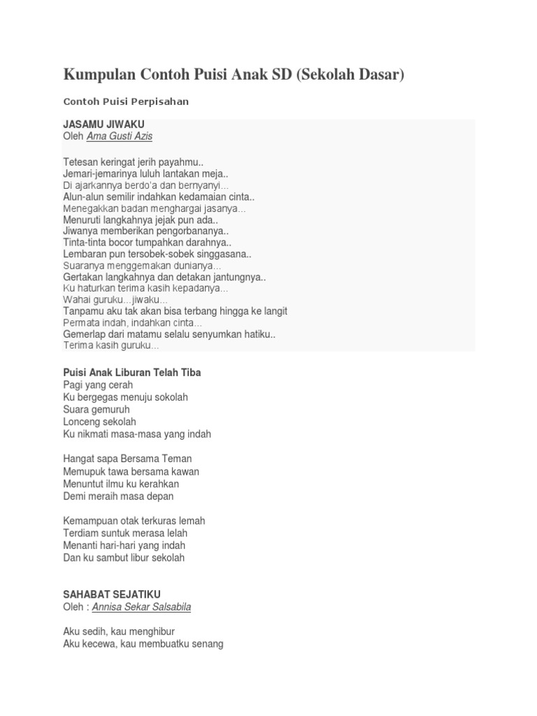 DOC) Kumpulan Puisi pendek Anak Sekolah Dasar | Panida Nurfazira - Academia.edu