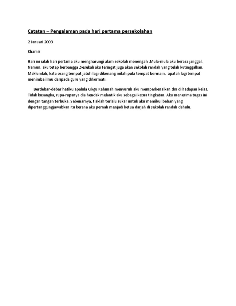 Contoh Karangan Diari Sehari. Pengalaman Hari Pertama di Sekolah Baharu
