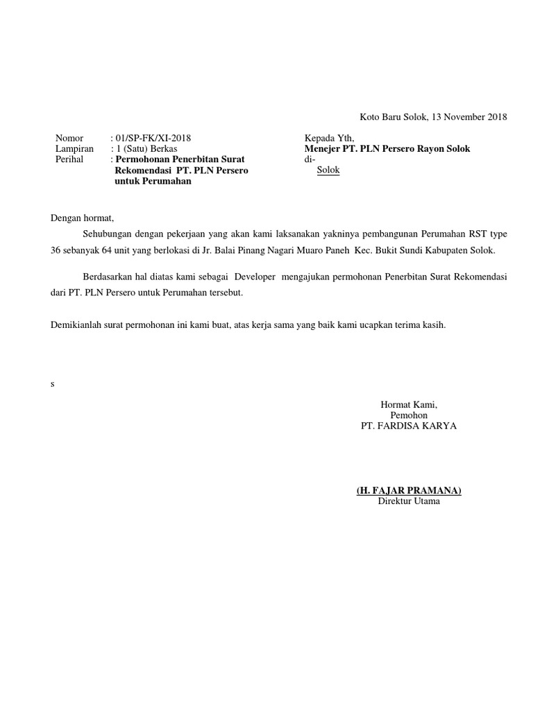 Surat Permohonan Rekomendasi Pln Untuk Perumahan
