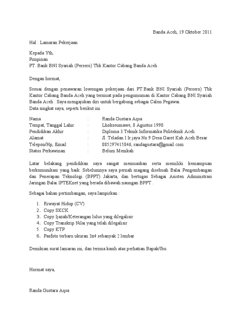 Contoh Surat Lamaran Kerja Bank Bni Syariah - Contoh Seputar Surat