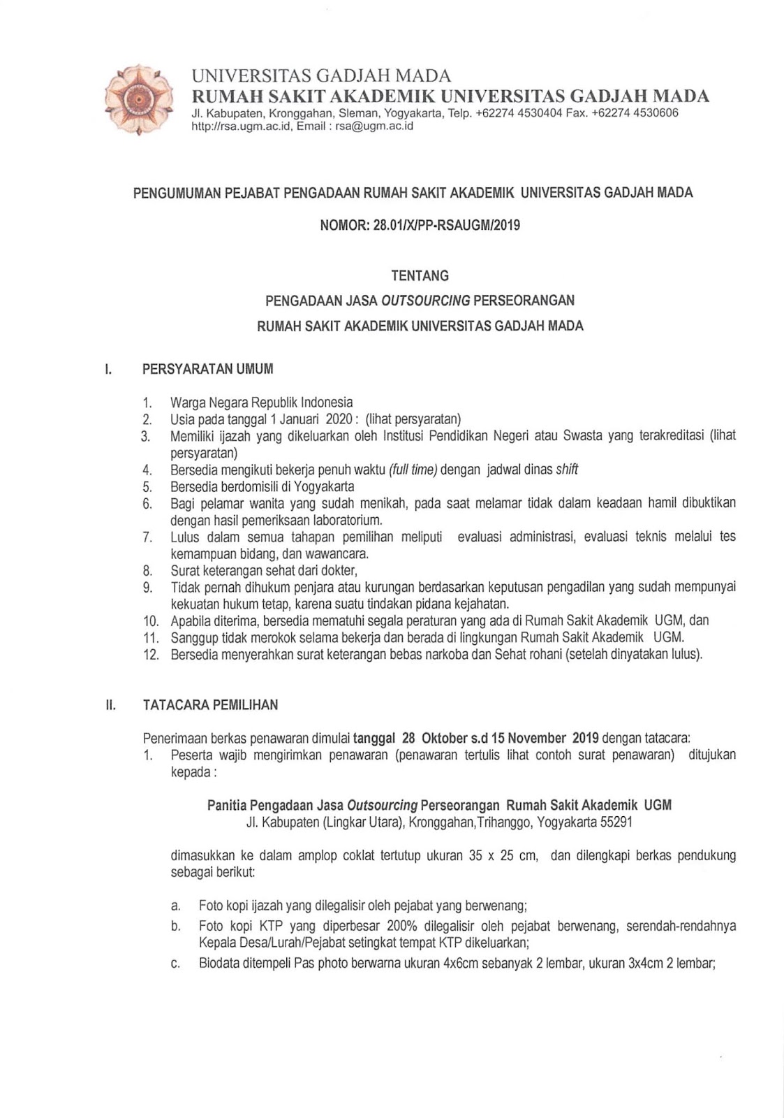 Rekrutmen Tenaga Outsourcing Rumah Sakit Akademik Universitas Gadjah Mada Tingkat SMP SMA SMK D3 S1 Tahun 2019 [155 Formasi] - REKRUTMEN LOWONGAN KERJA BULAN OKTOBER 2020