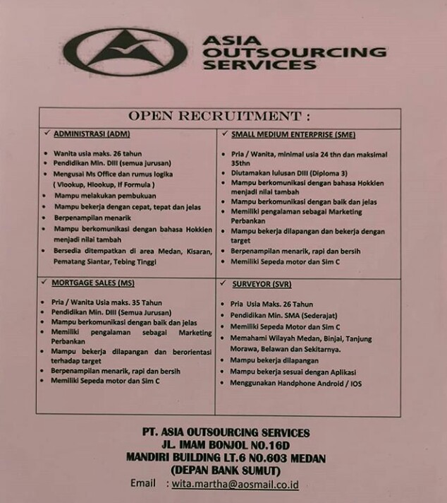 Lowongan Kerja Medan Di PT. ASIA OUTSOURCING SERVICES - loker Medan desember 2019