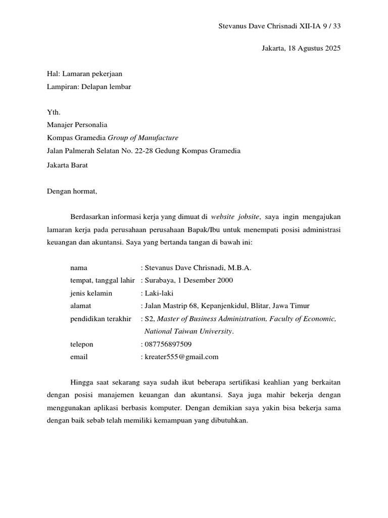 Contoh Surat Lamaran Kerja Kompas Gramedia