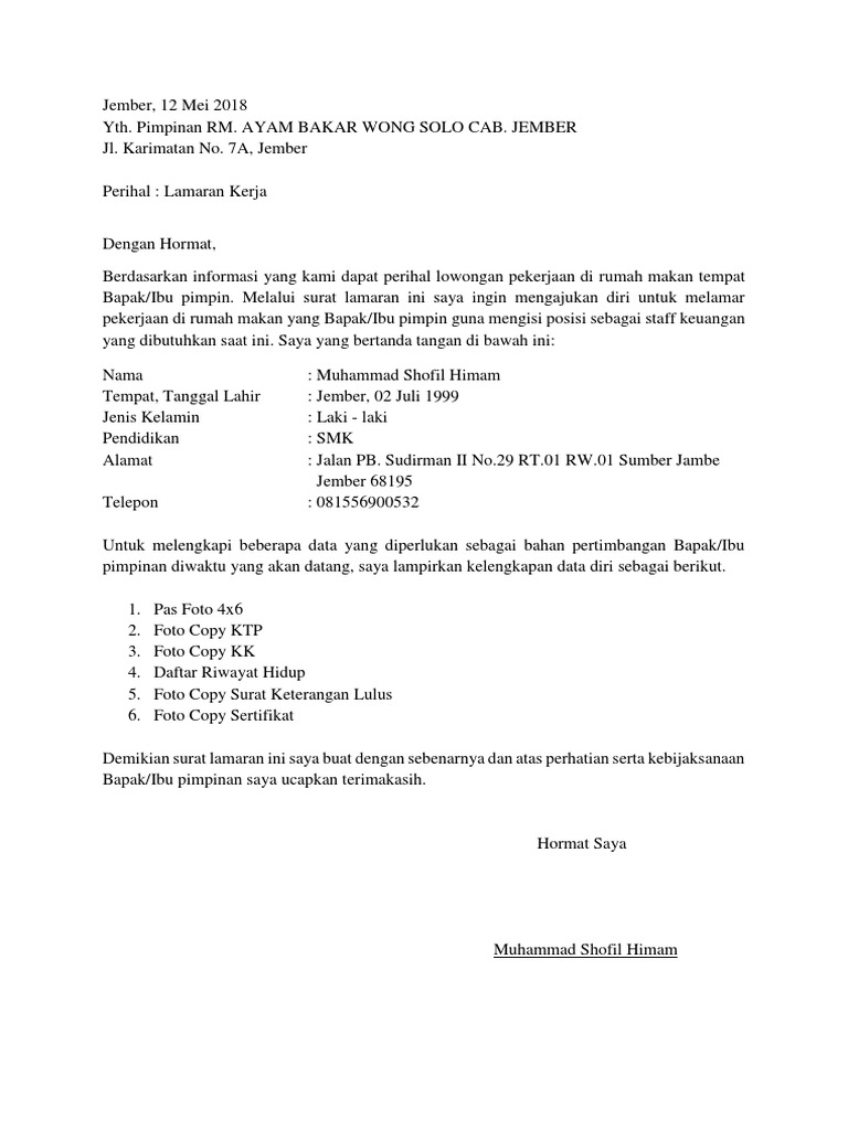 Contoh Surat Lamaran Pekerjaan Di Rumah Makan - Contoh Seputar Surat