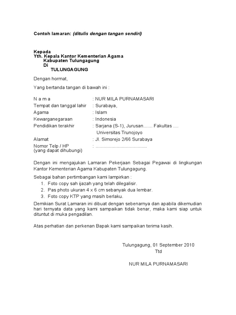 Contoh Surat Lamaran Kerja Cpns Kementerian Agama