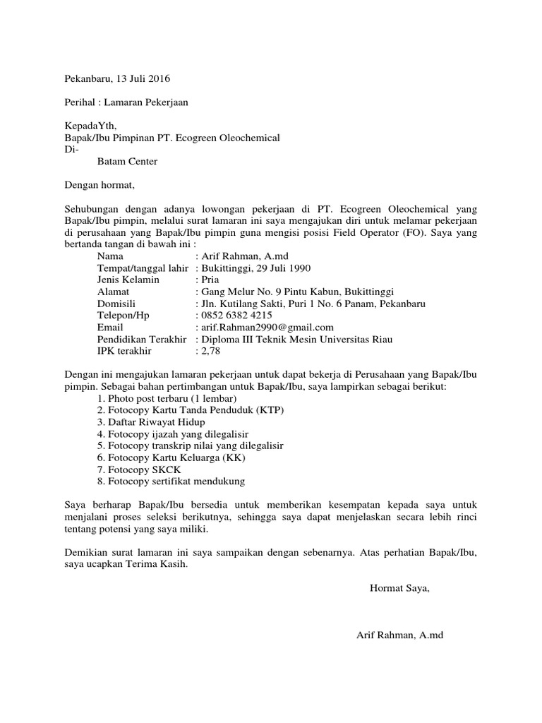 Contoh Surat Lamaran Kerja Di Pt Batam - Dapatkan Contoh