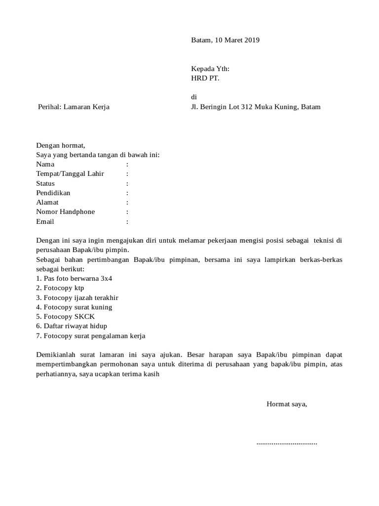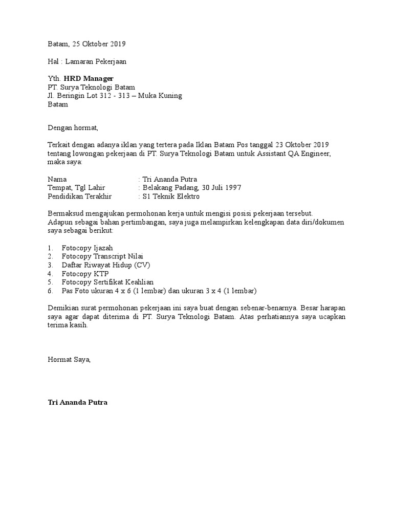 Contoh Surat Lamaran Kerja Pt Batam