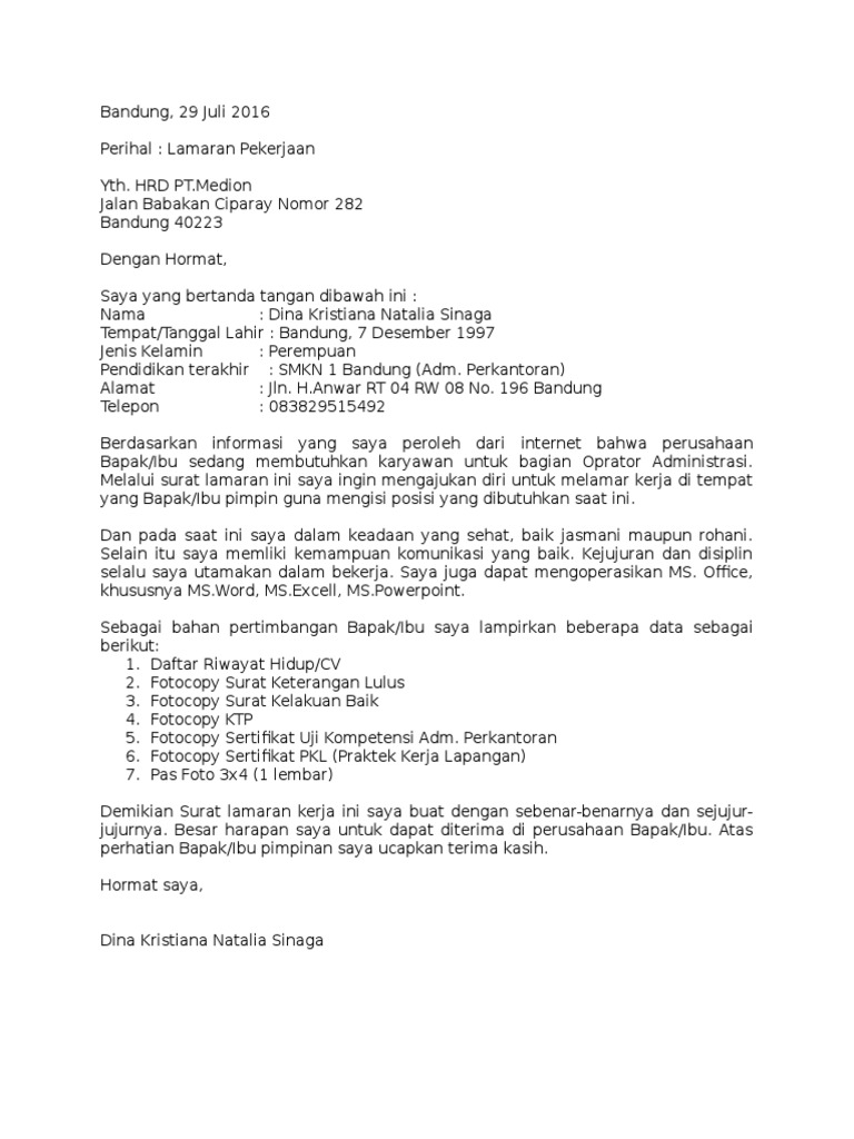 Contoh Surat Lamaran Kerja Pt Medion