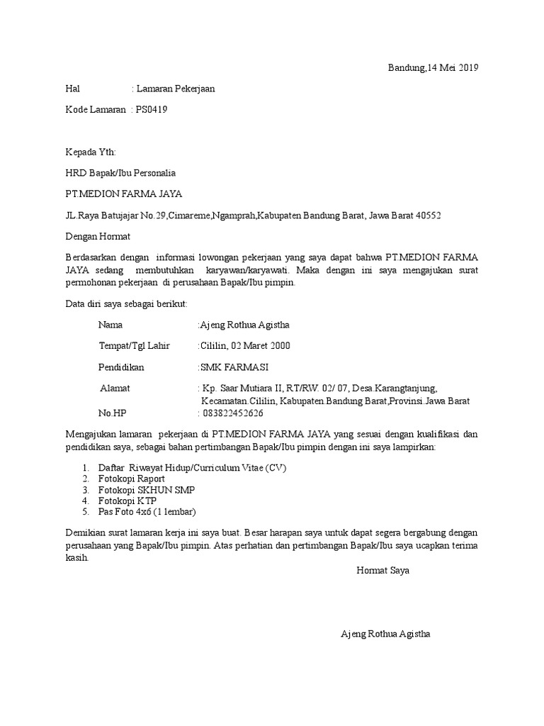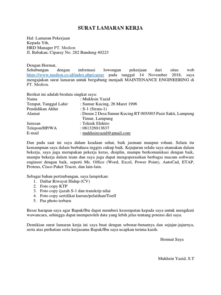 Contoh Surat Lamaran Kerja Untuk Pt Medion
