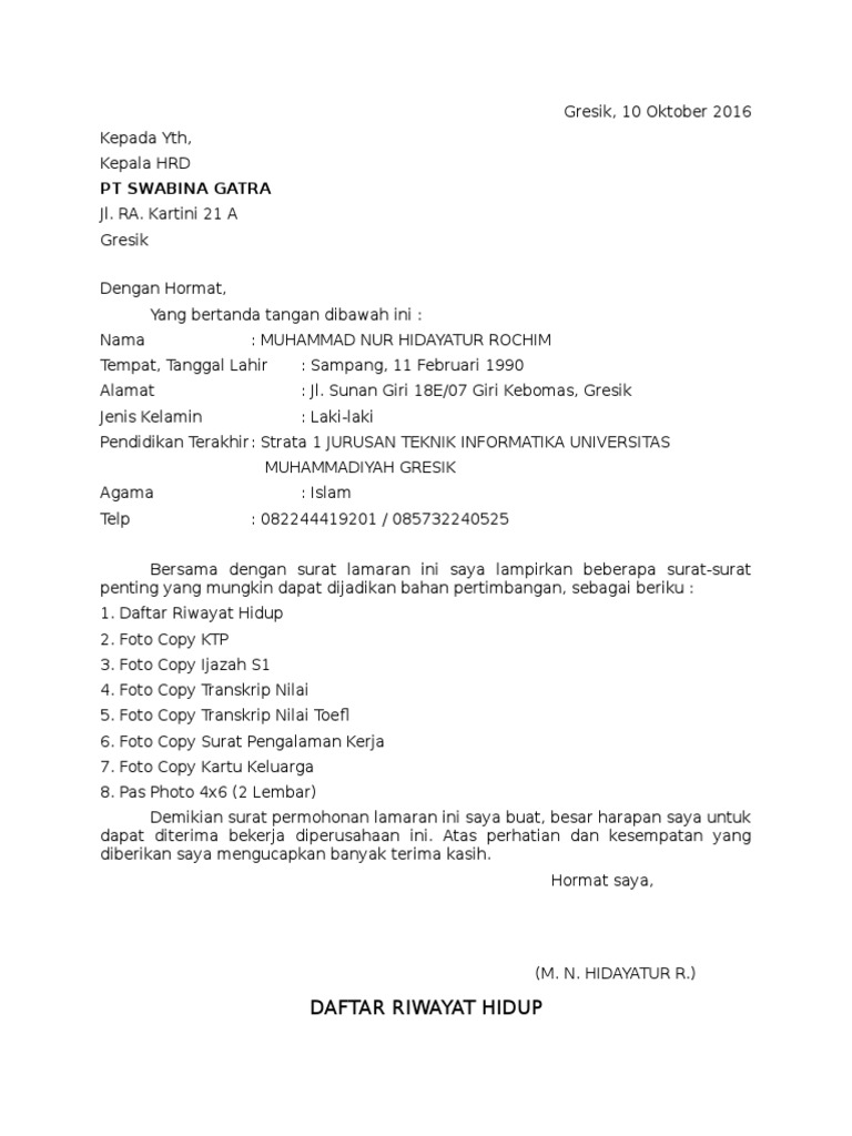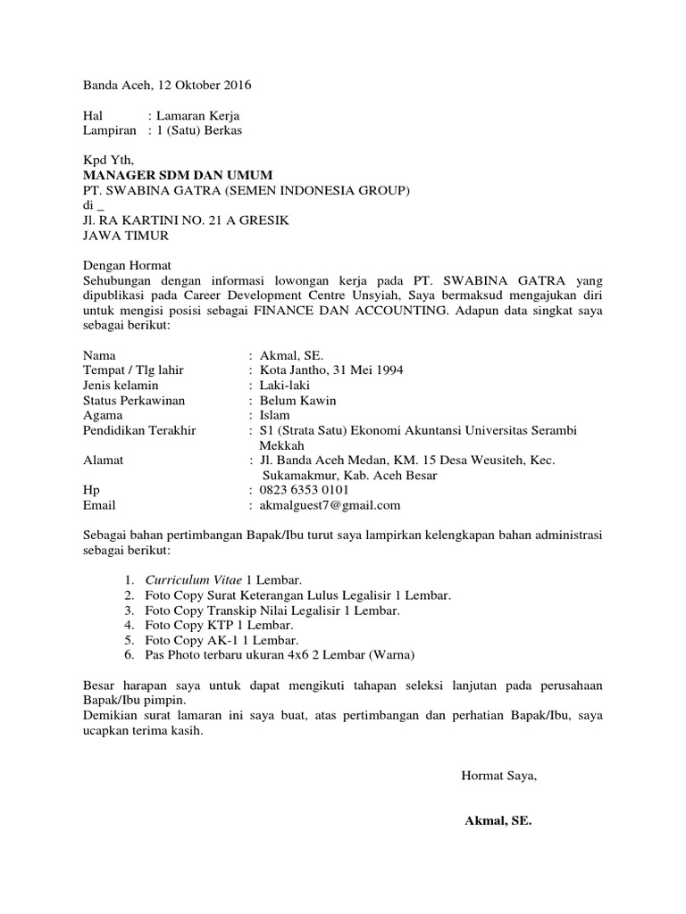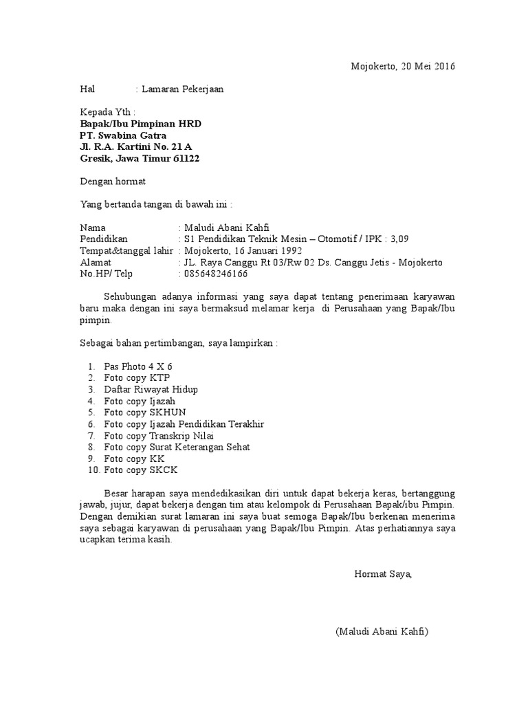 Contoh Surat Lamaran Kerja Pt Swabina Gatra