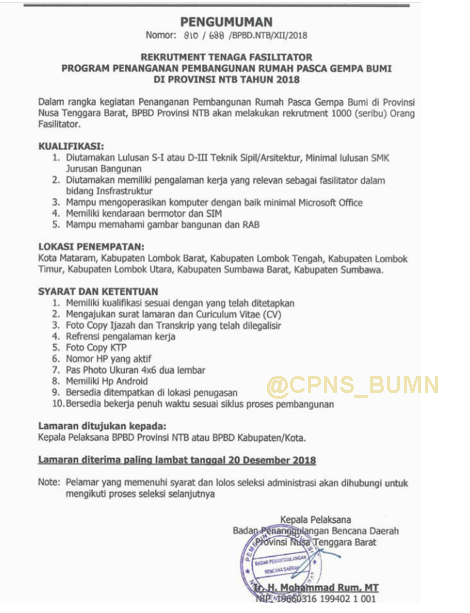 Rekrutmen Tenaga Fasilitator Badan Penanggulangan Bencana Daerah Provinsi NTB [1000 orang] - REKRUTMEN LOWONGAN KERJA BULAN OKTOBER 2020