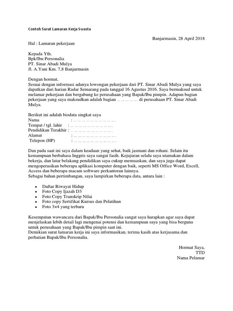 Contoh Surat Lamaran Pekerjaan Karyawan Swasta di 2020 | Surat, Pimpinan, Tingkat pendidikan