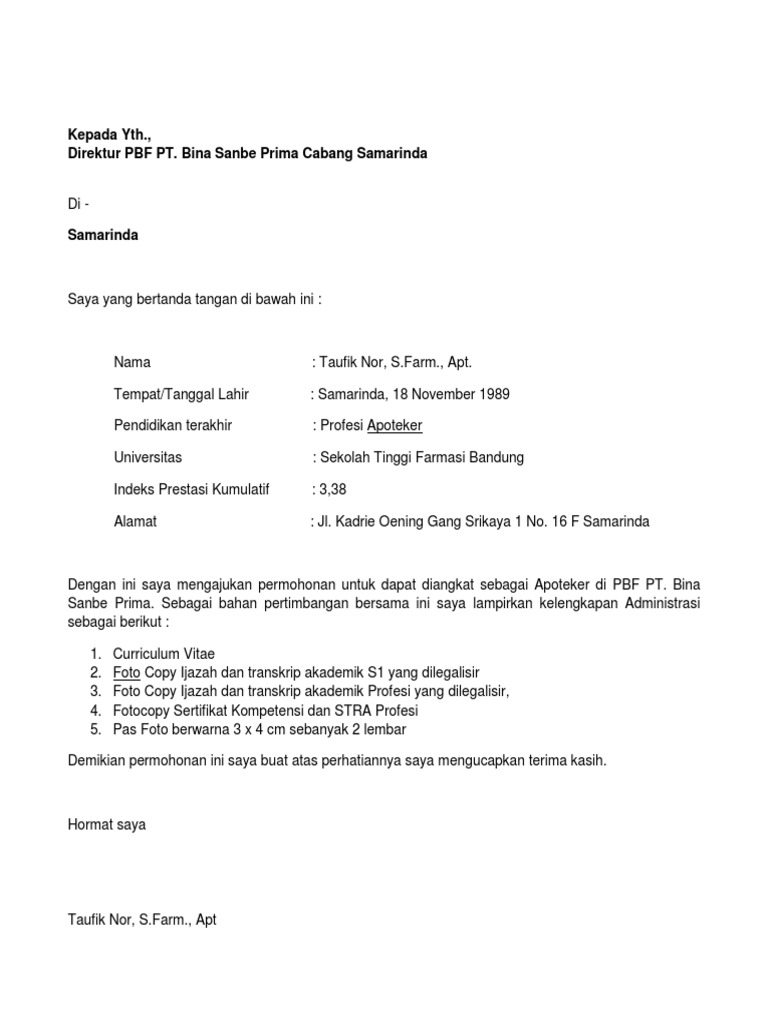 Contoh Surat Lamaran Kerja Di Apotek