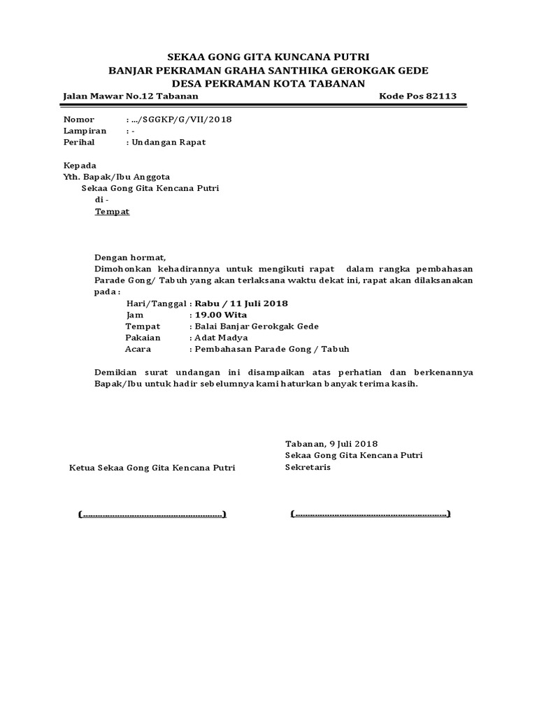 contoh-surat-undangan-rapat.docx - SEKAA TERUNA PUTRA DHARMA Banjar Saba Kediri Tabanan 13 Agustus 2019 Nomor 28/XIIMIPA4/2019 Lampiran Hal undangan | Course Hero